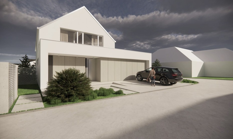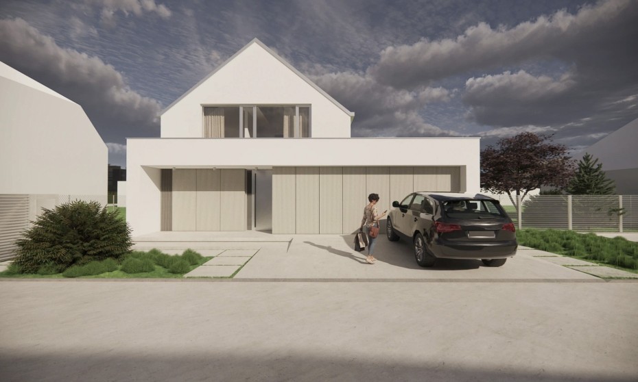 The construction and architecture of the house form a coherent volume, where the load-bearing system of the attic directly connects to the walls of the ground floor through monolithic ring beams, ceilings, and partially the walls of the upper floor. The house is founded on a concrete base slab and strip foundations. The vertical structures are masonry, arranged logically according to the layout: on the ground floor between the garage section and the common area; on the upper floor around its perimeter, resting on the walls of the ground floor. The ring beams, ceilings, and some upper floor walls are reinforced concrete. The house façades are smooth white; the roofing is gray, and the adjacent exterior floors are designed from polished concrete or concrete paving. The ground floor is accented by walls clad with cement-fiber boards. The fencing is made from perforated steel profiles, with a hinged waste box and a pedestrian gate.