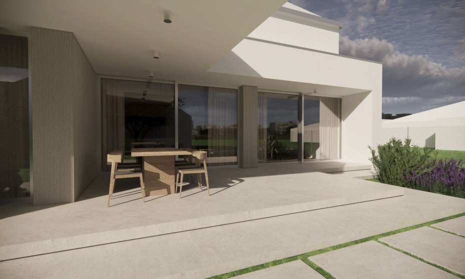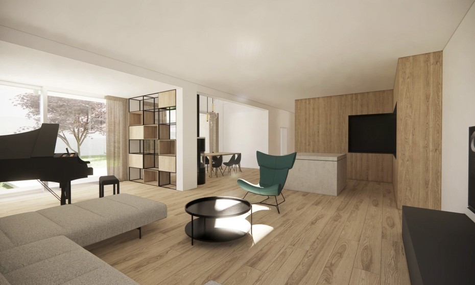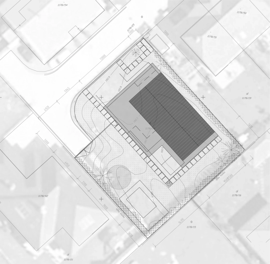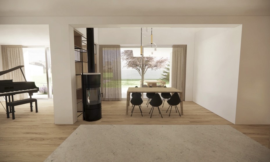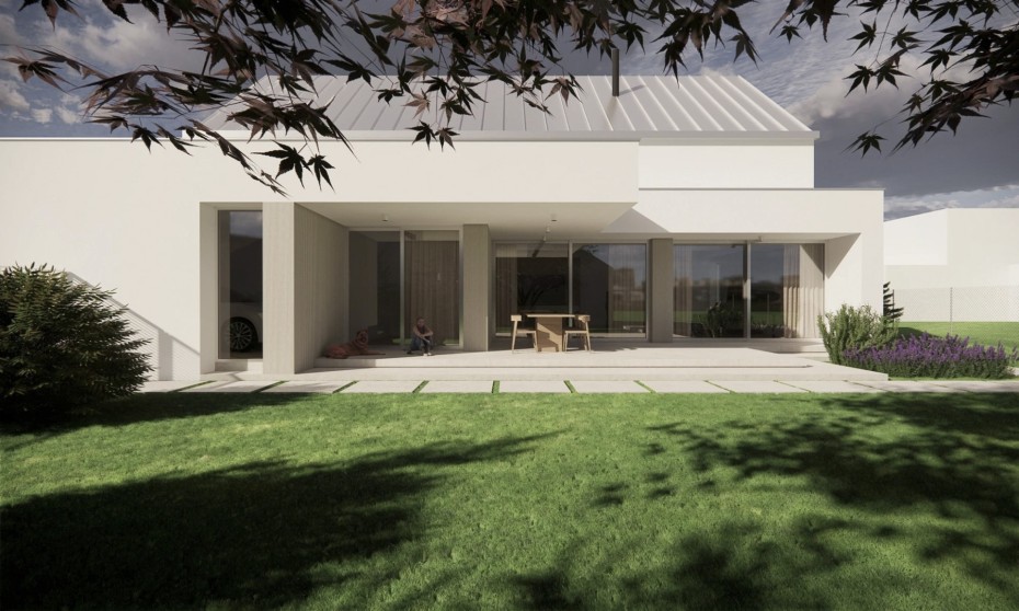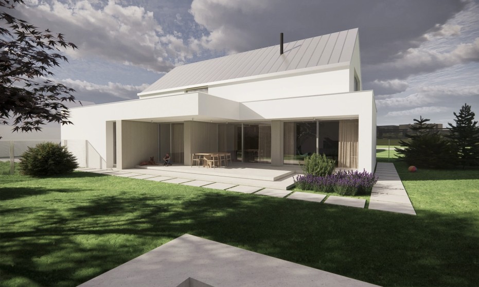 The fundamental character traits of the family house, including the landscaping adjustments, are: the house shape ensures privacy for the common areas and represents a dignified presence from the street; the architectural principle of the recessed gabled upper floor on the expansive ground floor with a flat roof; window orientation such that except for the northwest-facing ones, no additional exterior shading is needed; an exterior shelter above the terrace integrated as part of the building without the need for attachments; views from the house directed toward the private garden; simplicity, logic, and rationality in the spatial layout combined with a modest amount of generosity.