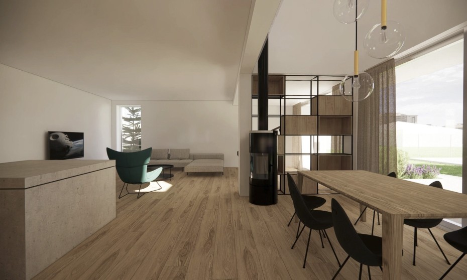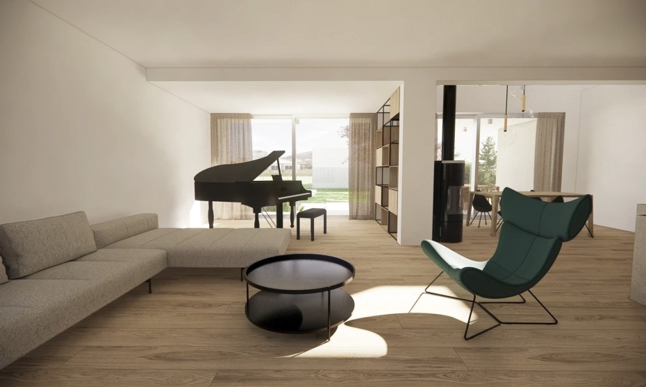 Due to the spatial demands of the ground floor, the upper floor is recessed. The setback of the gabled upper floor compared to the large-area ground floor creates the main architectural and construction principle. Hardened surfaces on the property are designed for vehicle access and outdoor parking, as well as for private relaxation and outdoor activities on the covered terrace between the interior and the garden.