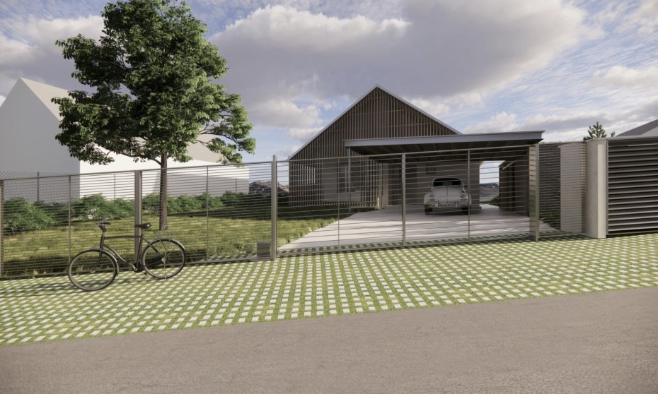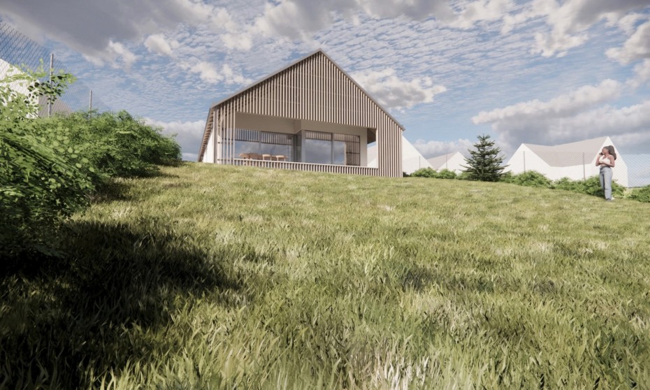 The aim of the study is the new construction of a single-story house on the top of a sloping plot, designed to serve a family of four. Besides the house, the plot will include a covered parking space for two cars and a workshop with storage and parking areas for bicycles and a motorcycle.