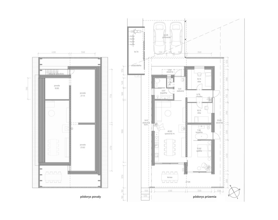 The house is founded on a base slab, with masonry vertical structures along the common and private parts of the house. The private part has a simple wooden ceiling and an attic for storage, the common part is open to the roof. The roof is gable, wooden, with a truss consisting only of wall plates and rafters. Some wall plates are steel. Roof overhangs are adapted to the functions of the adjacent areas. The eastern living veranda has a larger gutter overhang, and the western service path a smaller one. The northern windbreak and southern terrace are generously covered by gable parts of the roof. The roof pitch is 35°. The house’s gables are made of perforated wooden slats, which form the conceptual architectural and daylighting principle. In summer, they protect the interior from overheating, and in winter, they allow full sunlight. The facades are white, smooth; roofing including steel elements and window frames is gray; exterior adjacent floors are designed from brushed concrete. Western windows including the terrace are protected from overheating by screen blinds on cables. On the north side, there is a steel-wooden carport for two vehicles and a masonry workshop with storage, an extensive green roof, and steel-wooden sliding doors.