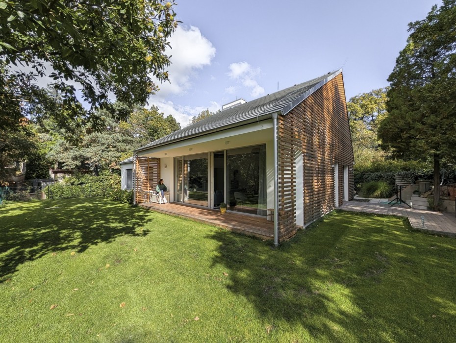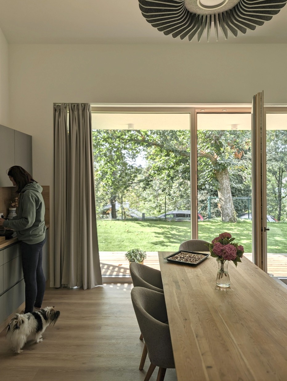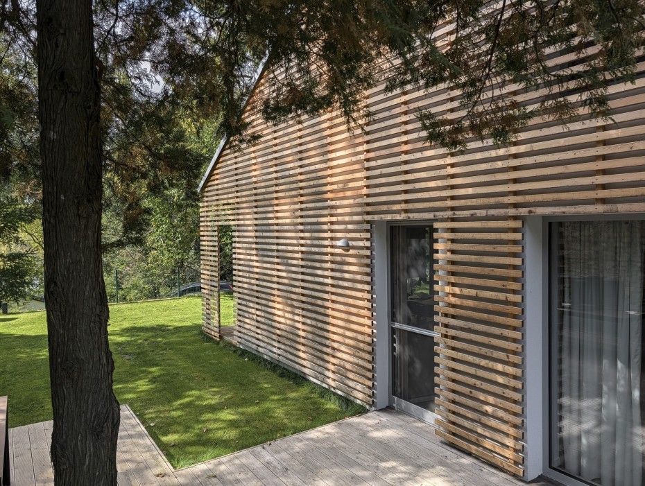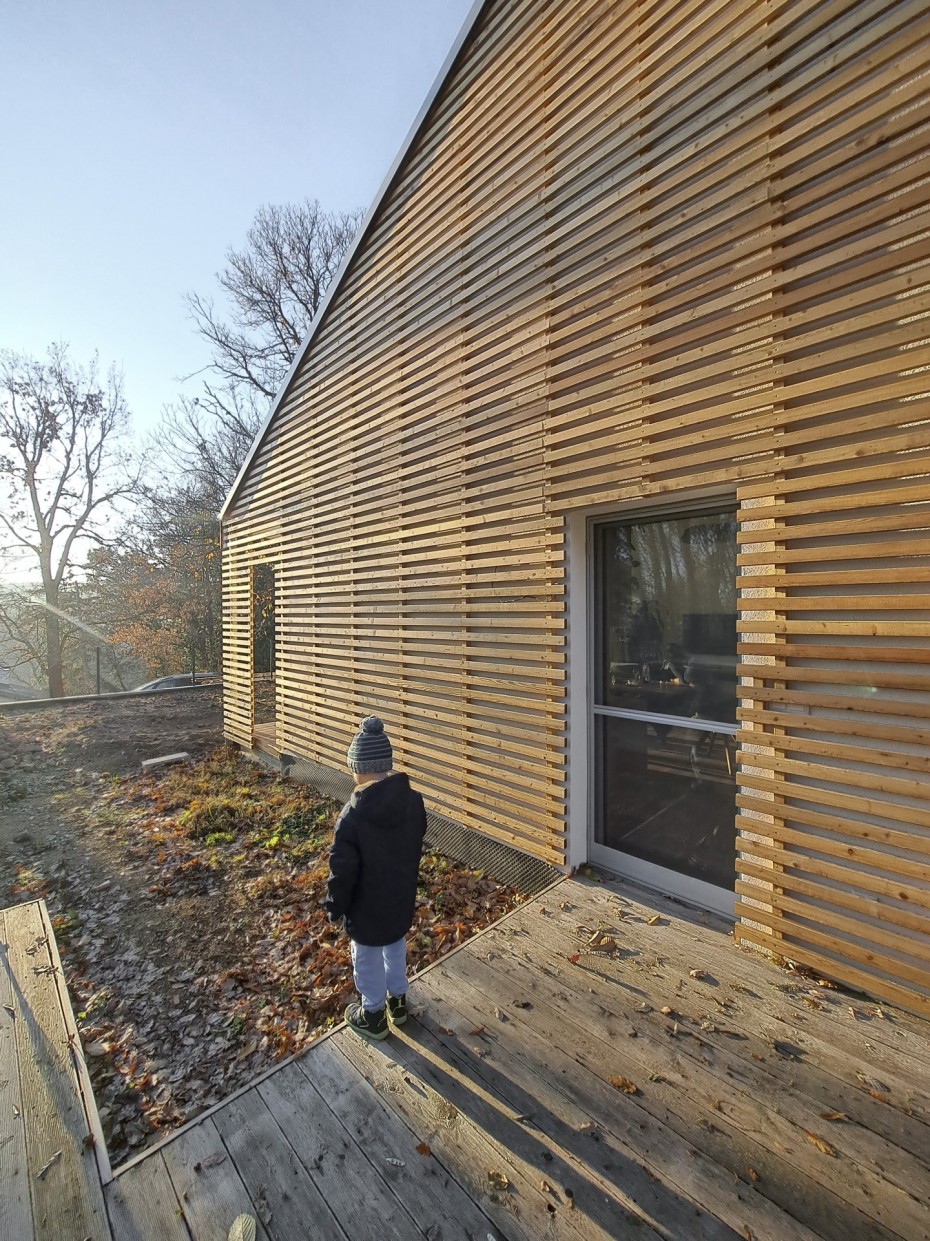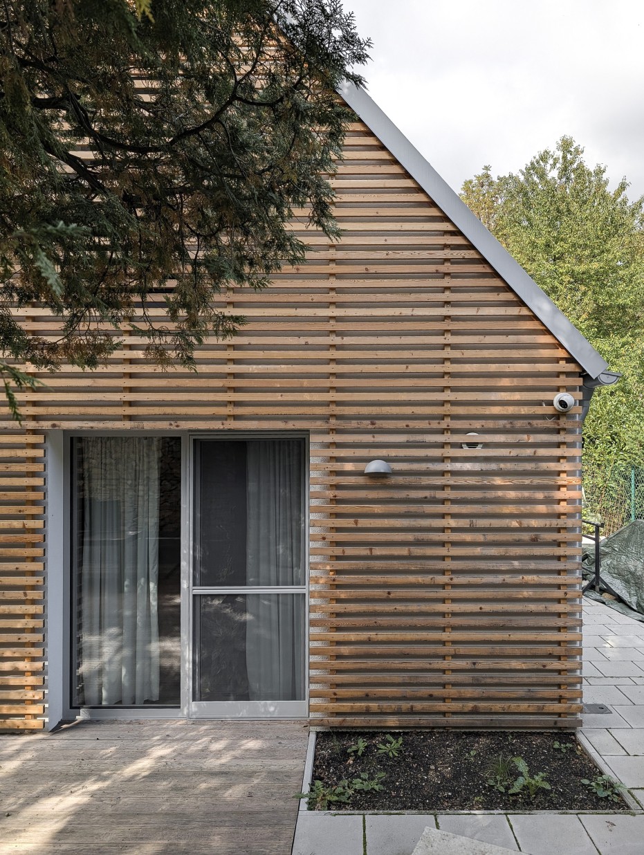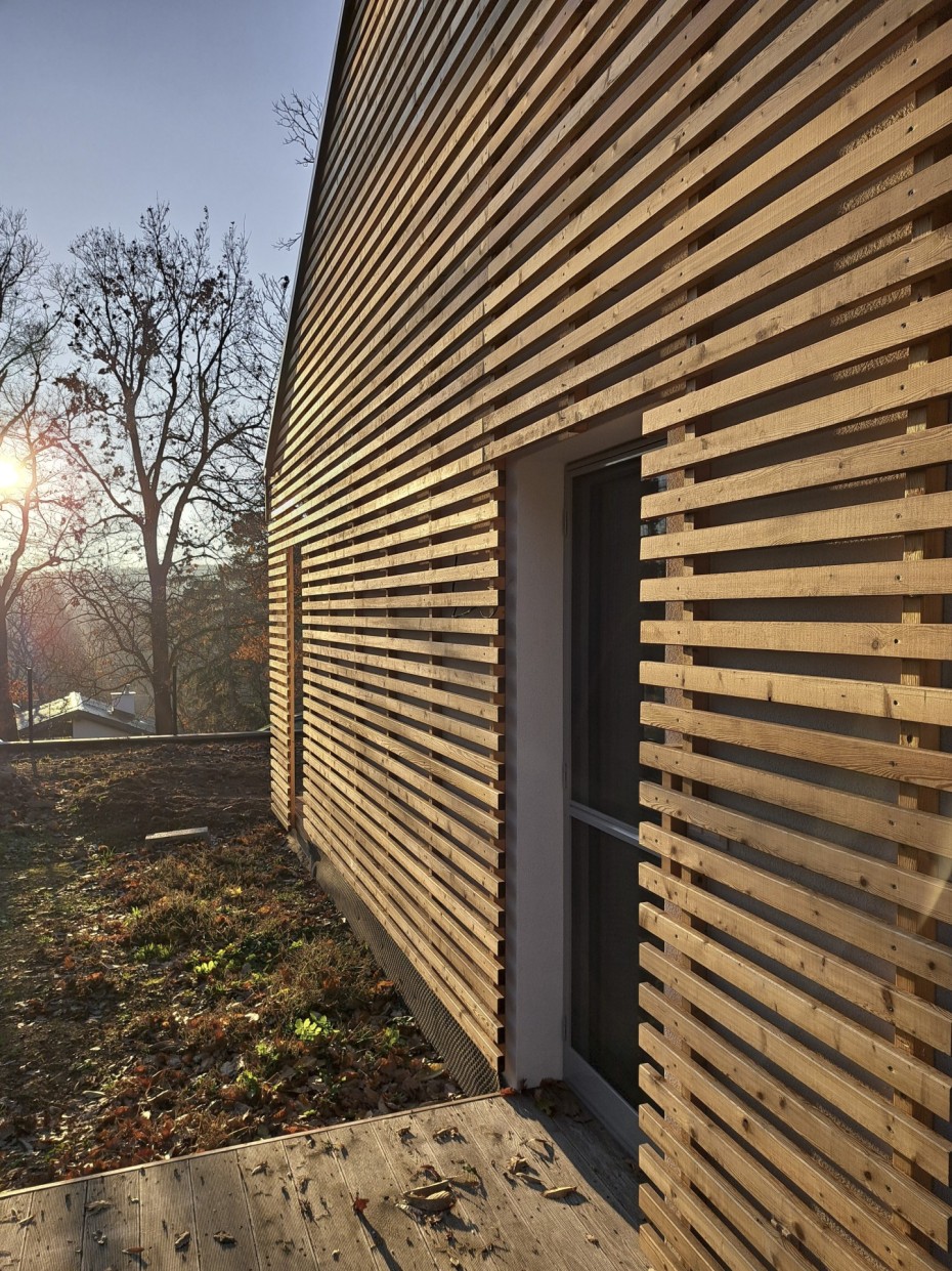 The house in the forest is self-assured because it does not demand to compete for attention in a visual battle with neighboring buildings. It does not need a garden, as it already enjoys a view of the forest. It does not require a tall masonry fence, being located on the edge of an urbanized area. It is not protected from strong sunlight, but summer sun rarely penetrates the trees. It does not even need a balcony, as it is situated on a hill. This approach saved the owner costs both at the entrance and in operation. Last but not least, the old well-known motto applies: “There is beauty in simplicity.”