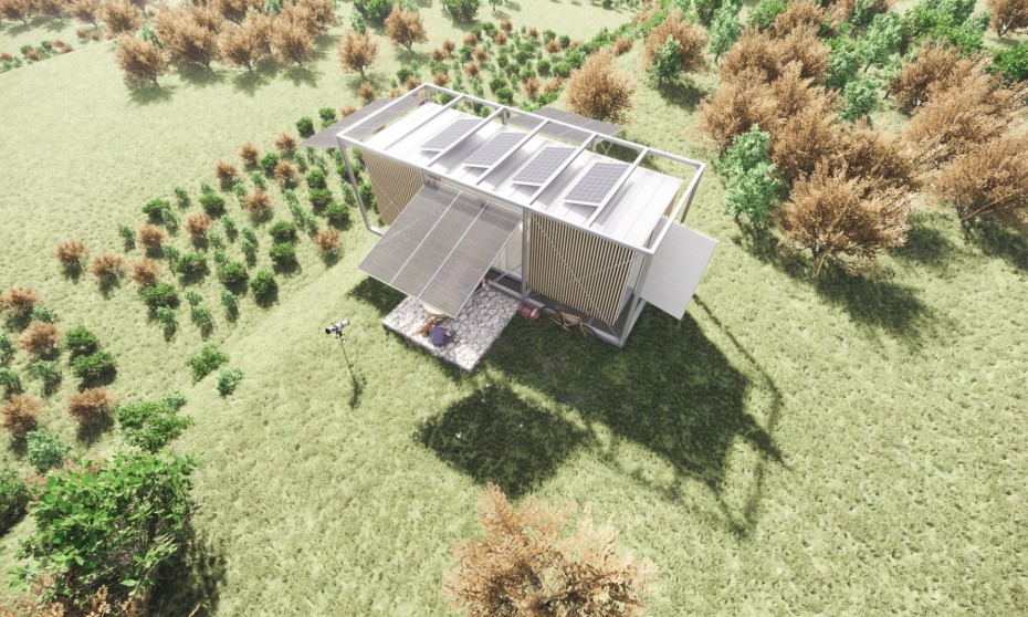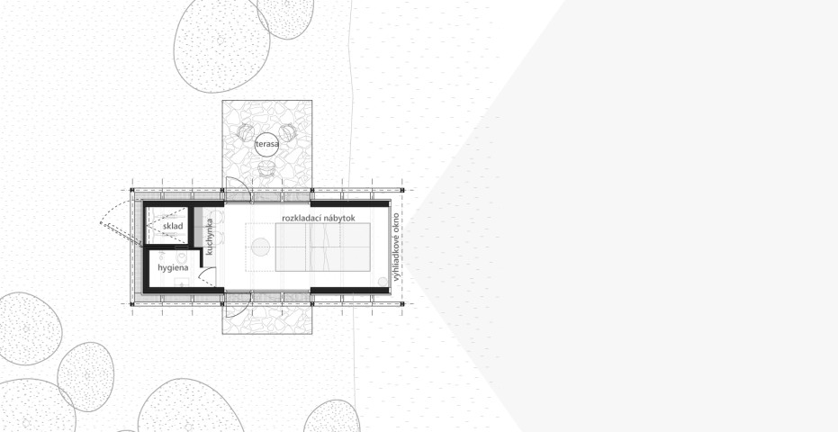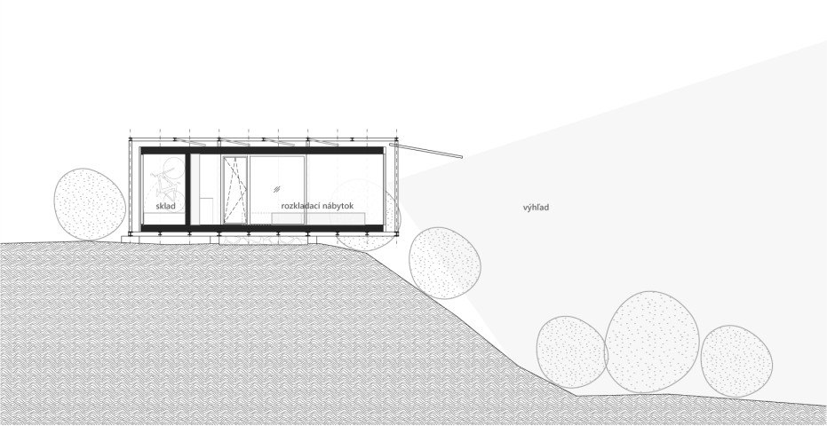 We chose a construction system based on lightweight steel HEB profiles and a wooden insulated wall system—e.g., glued CLT panels—with wooden cladding. The steel frame forms the structural skeleton that can be mounted on a trailer or on solid ground and serves as a sturdy frame for anchoring flexible, foldable shading shelters made of steel mesh. This steel structure can be opened or closed depending on the time of year, sun position, preferred views, or intuitive needs. Its primary function is shading and protection against external influences—harsh sun, rain, and even vandalism. The wooden wall construction around the interior features a large glazed surface oriented towards the landscape view.