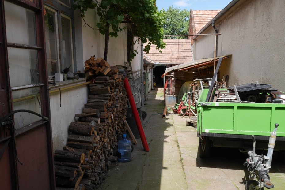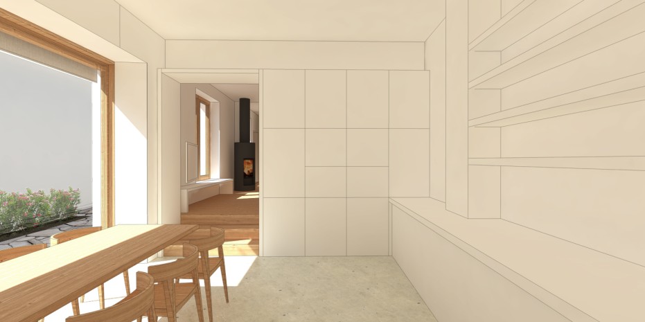 Even in this case of a narrow vineyard plot, we did not abandon the traditional principle of a narrow house and narrow yard, which we consider appropriate. For today’s needs of covered parking, the original concept of roofing the space behind the entrance gate is also justified. We preserved the original house’s exterior walls and minimally intervened in the layout of the open-plan interior by only building partitions around the sanitary facilities and sleeping rooms. All other internal room boundaries are formed by built-in furniture. The building is stabilized by a concrete ceiling, and the attic is a new structure composed of masonry and wooden constructions. Traditional elements, such as the roof overhang or dormer window, have been modernized. A small detail is the almost forgotten gutter made from chestnut wood, which is characteristic for this type of architecture.
