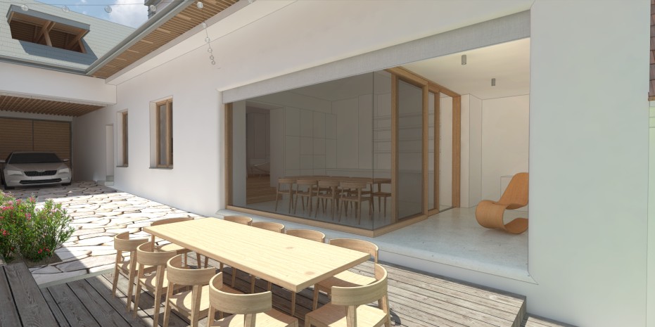 If I have to highlight the most significant feature of the house, it is undoubtedly the kitchen with its generous corner window, where glass meets glass at the corner. This element most influences the visual comfort and mood of the inhabitants inside and in the yard, completely breaking the barrier between exterior and interior. The intermediate space between the interior and the yard is a covered terrace ventilated by the chimney effect, which provides nearly constant shade in summer and extends the kitchen and dining function beyond its boundaries.