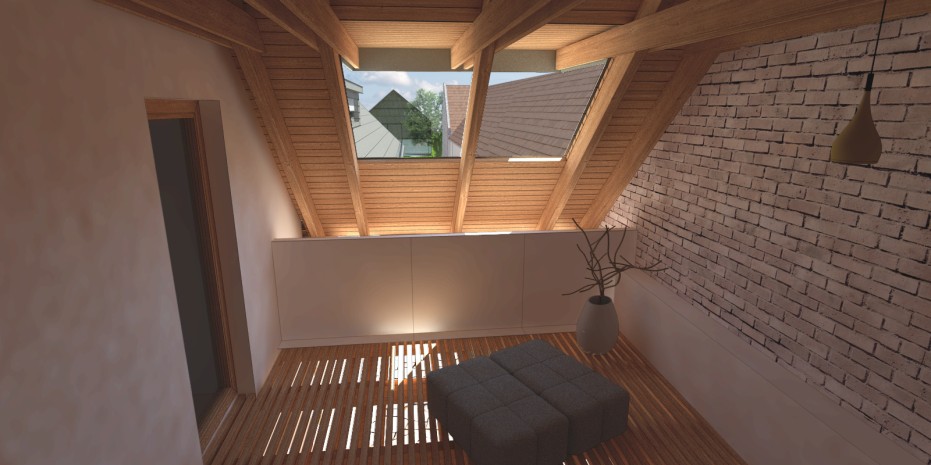 The price of this generous window could have been a downside in this project. However, since it was not necessary to heat and fully convert the entire attic space into living quarters, we saved costs for the client on this part of the building. Above the parking space, only a lightweight terrace structure was created, offering a view beyond the house to a beautiful pear tree and the barn. This part remains in constant contact with the exterior and offers the family a space for private relaxation. The theme of privacy is addressed in the interior rooms, but it is often underestimated in exterior spaces. We did not forget it.