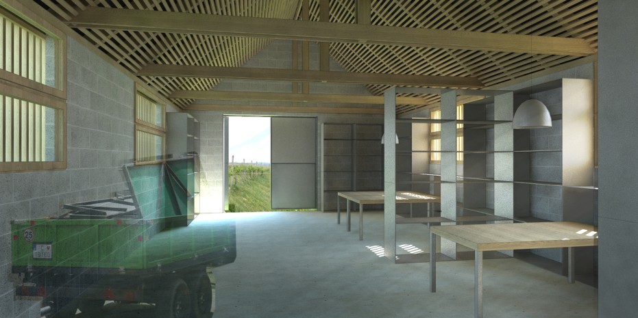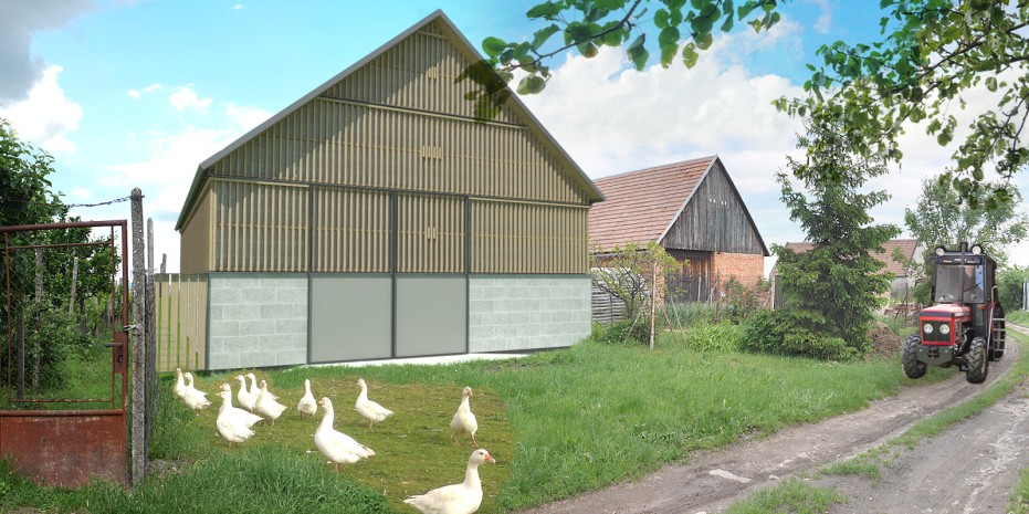 Behind the plot lies agricultural land, where we placed the new barn. It is characterized by walls made of exposed formwork blocks, perforated wooden slats, and corrugated fiber-cement roofing.