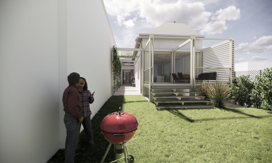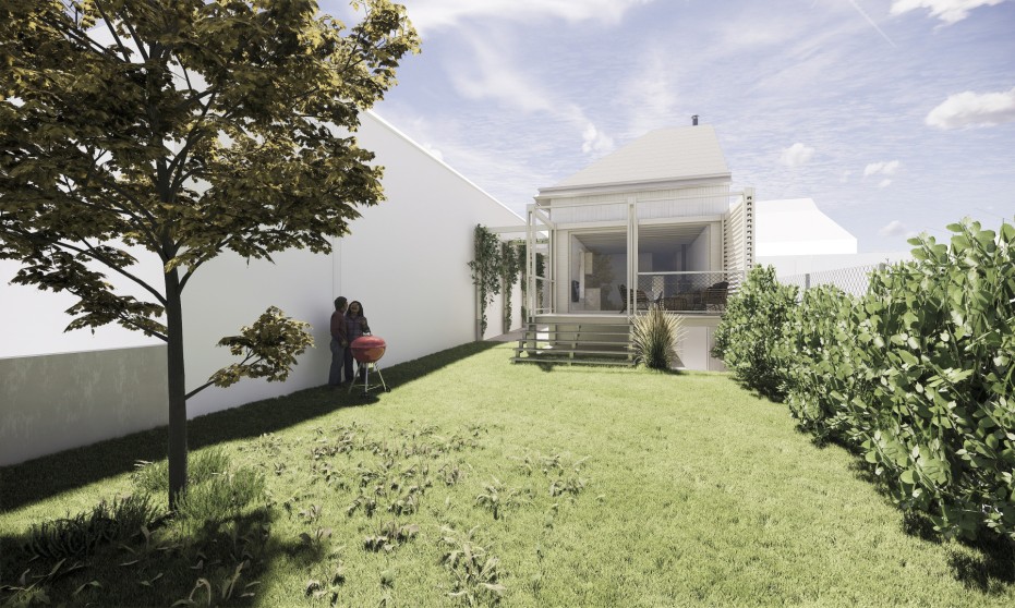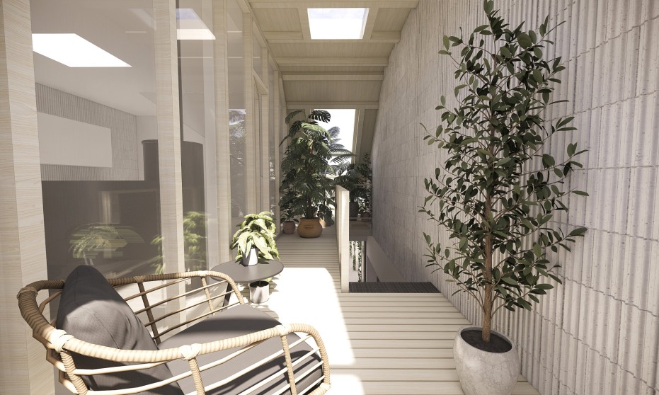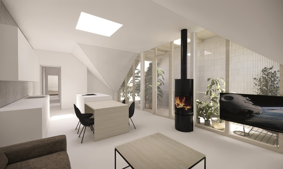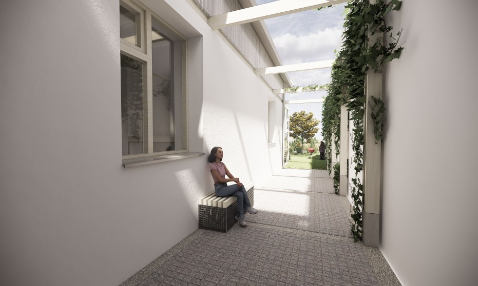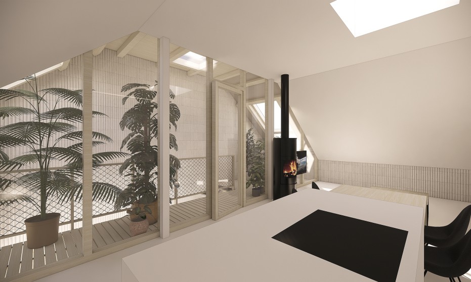 The family house is designed as a two-storey apartment. The common area is an entrance hall brightened by a winter garden, which can also be used as a covered parking space for one vehicle. From this space, there is access to a staircase leading to the upper floor and a room housing technical facilities. Emphasis is placed on connecting the living area with the garden through a terrace on the level of the first floor. The layout is connected by a corridor along which built-in furniture with ample storage runs. The winter garden brings a unique and special atmosphere into the house. It is illuminated from both sides by two large roof windows and a skylight above. The attic’s living area is separated from the winter garden by a lightweight glass partition, visually connecting the two spaces. Pleasant daylight is provided by a skylight in the center of the layout. The existing basement under part of the building remains in its authentic state. Reconstruction solutions will focus on capturing and diverting rainwater away from the house to eliminate current moisture problems in the basement.
