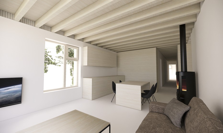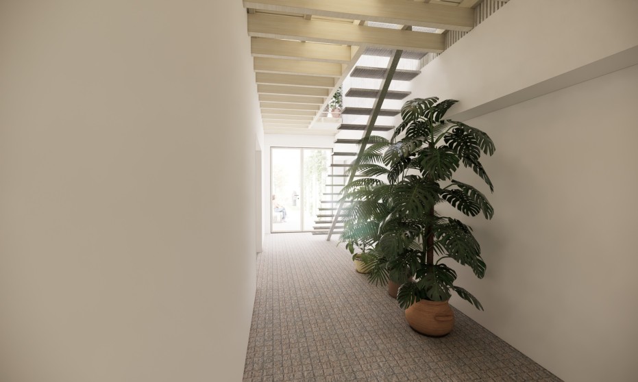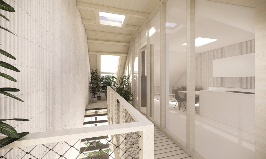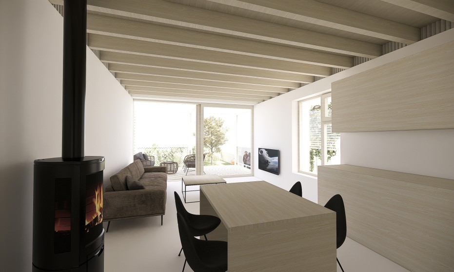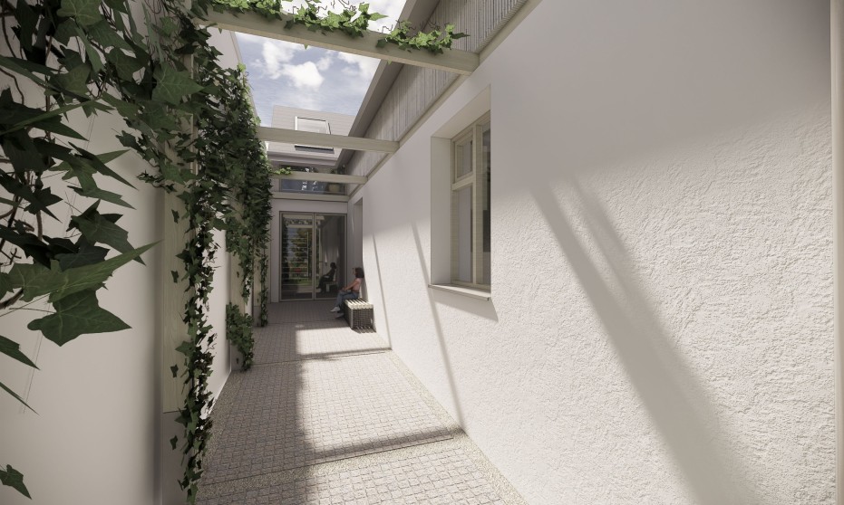 From the original house, the exterior walls up to the ceiling above the first floor are retained. The ceilings above the first floor will be wooden beam ceilings with the structure exposed. The new masonry on the second floor will be made of thermal insulation ceramic blocks without additional insulation. The exposed brickwork will remain unplastered, painted white to create an authentic material expression and simplify the construction process. The roof structure is supported by the load-bearing walls. Part of the roof is flat with vegetation that slows down stormwater runoff. The remaining part has a 40° slope with concrete (or ceramic) roofing. The attic spaces are brightened by roof windows, skylights, and light tubes.