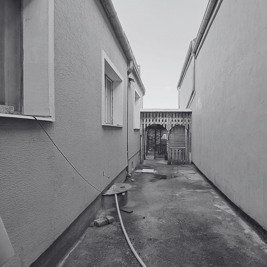 The house’s architecture is characterized by authentic materials, a typical concept of old simple houses: plaster on the ground floor, exposed brick painted white on the upper floor, concrete, wood, metal—no imitations or pretensions. The house is visually divided into two parts by a hard-lined pergola. The pergola gives character to the cold and narrow courtyard and allows its use not only as a passage to the rear of the plot.