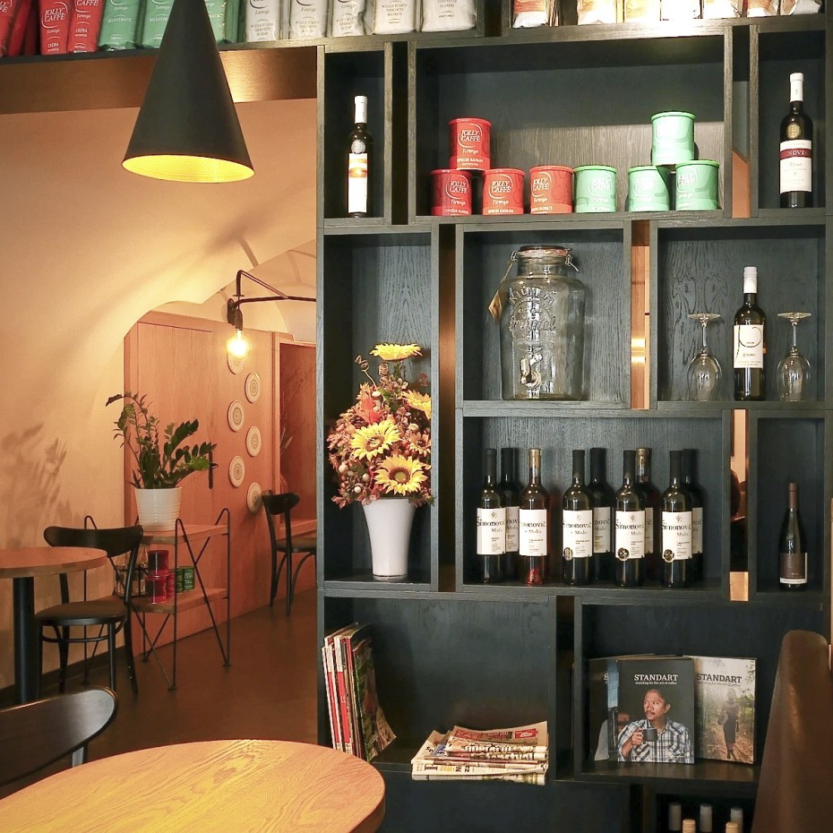 V kaviarni sme sa venovali viacerým atypickým riešeniam: na mieru sme navrhli pult, zápultie, prípravovňu, policovú stenu, obklady, lavice aj stoly. Pre zámočníka sme pripravili podklady na výrobu svietidiel v klenbovej časti a pre keramikára návrh okrasných stolíkov na dekorácie.