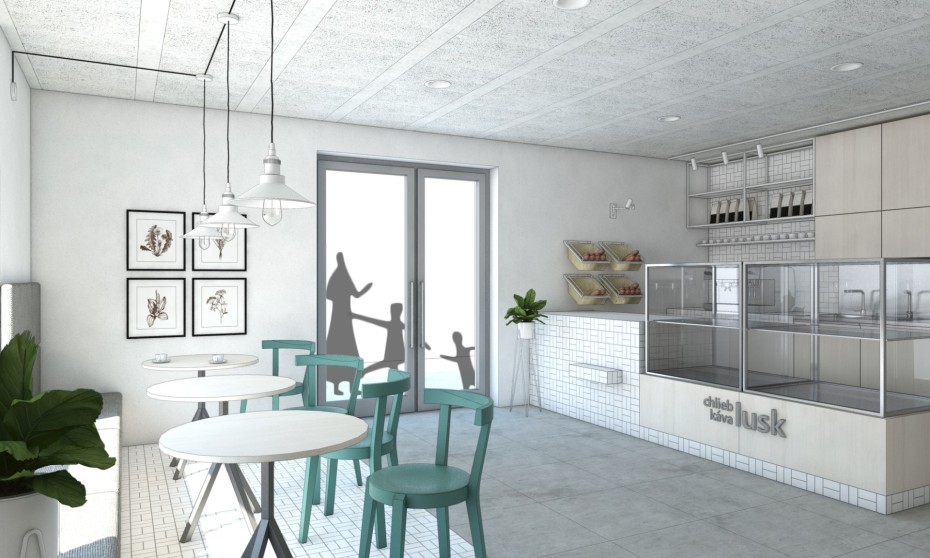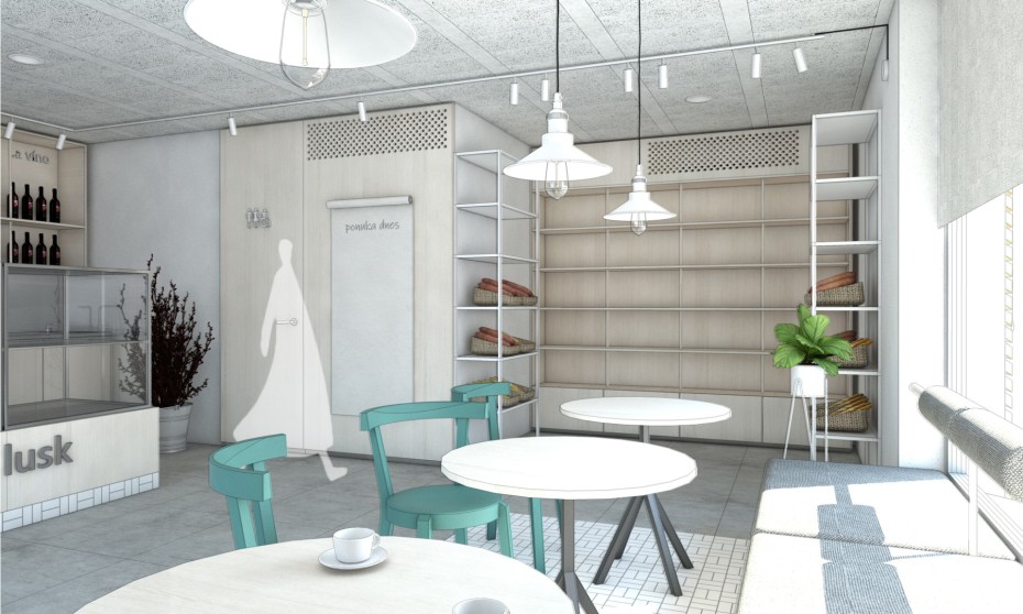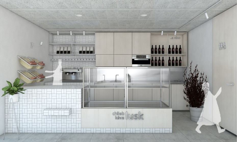 Kombinácia svetlých prvkov: betónová dlažba, lesklá keramická mozaika, buková preglejka, prírodné a kovové doplnky; by spolupôsobením mali vytvoriť optimistickú atmosféru a komfortný priestor pre gastrozážitky z čerstvého chleba, kávy a iných produktov. Rozhodli sme sa pre neopracovaný montovaný strop. Viac prezrádzajú obrázky.