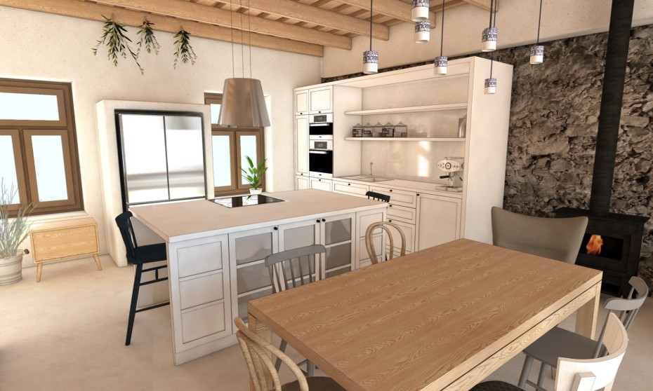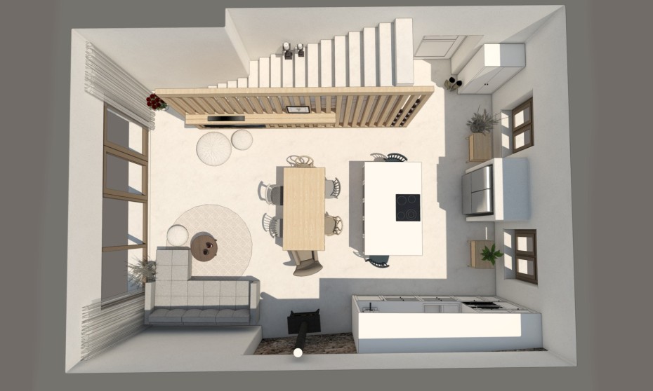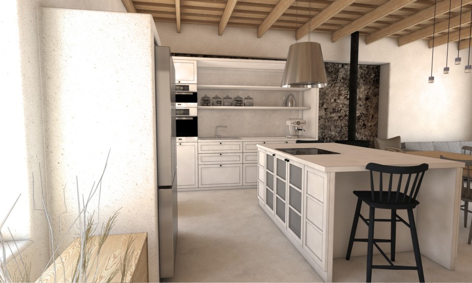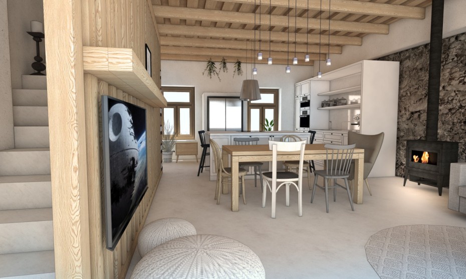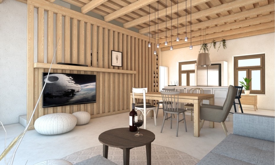 Išlo o menšiu bartrovú zákazku pre priateľa, ktorej cieľom bolo navrhnúť spoločenskú miestnosť v kompaktnom priestore staršieho rodinného domu. V interiéri sa prirodzene prelínajú dva prístupy: rustikálny a moderný. Moderný pohľad sme uplatnili pri efektívnom využití priestoru a prispôsobení aktuálnym potrebám, zatiaľ čo rustikálny sa odrazil vo výbere materiálov a citlivom dotváraní detailov priamo na mieste.